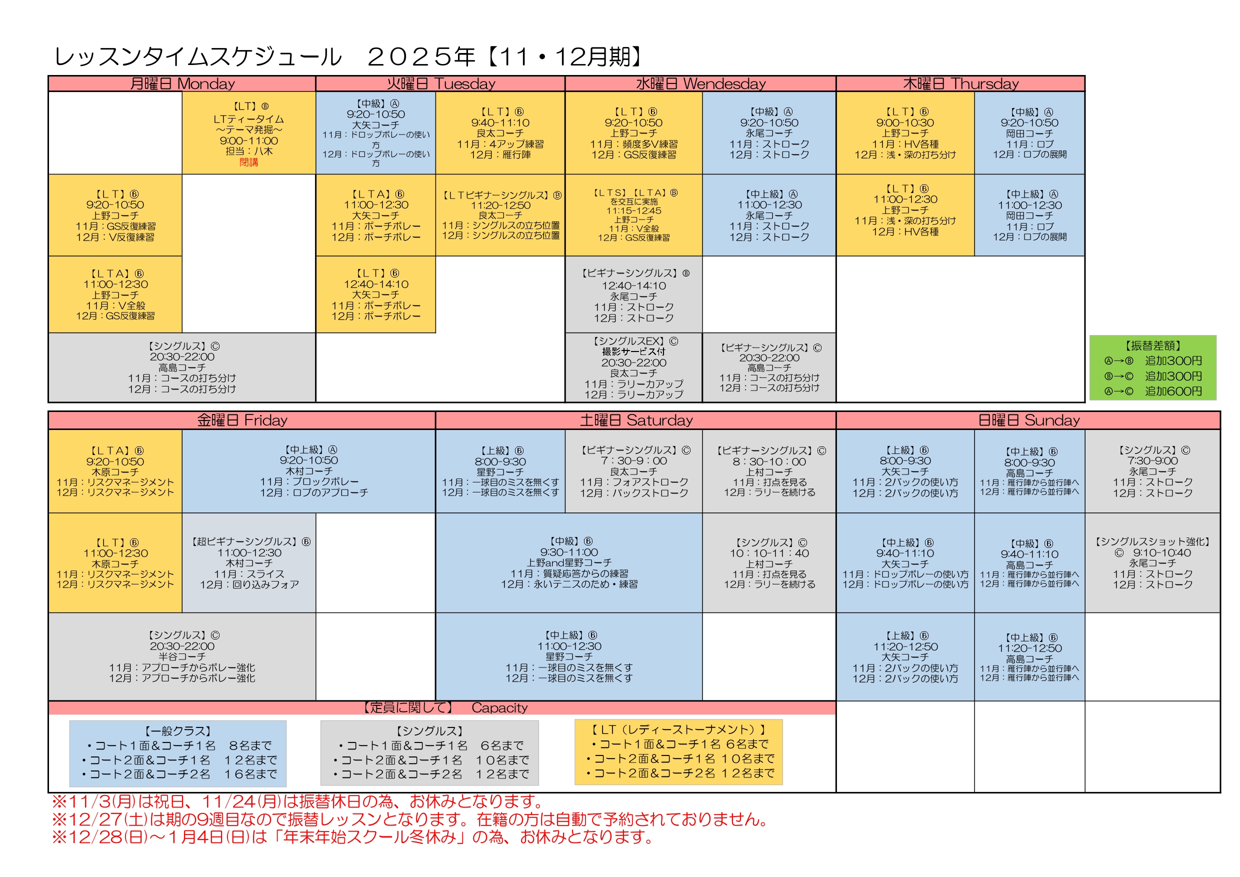 | 火曜日 | 11:20~ | LTビギナー シングルス | 良太コーチ | 空きあり |
